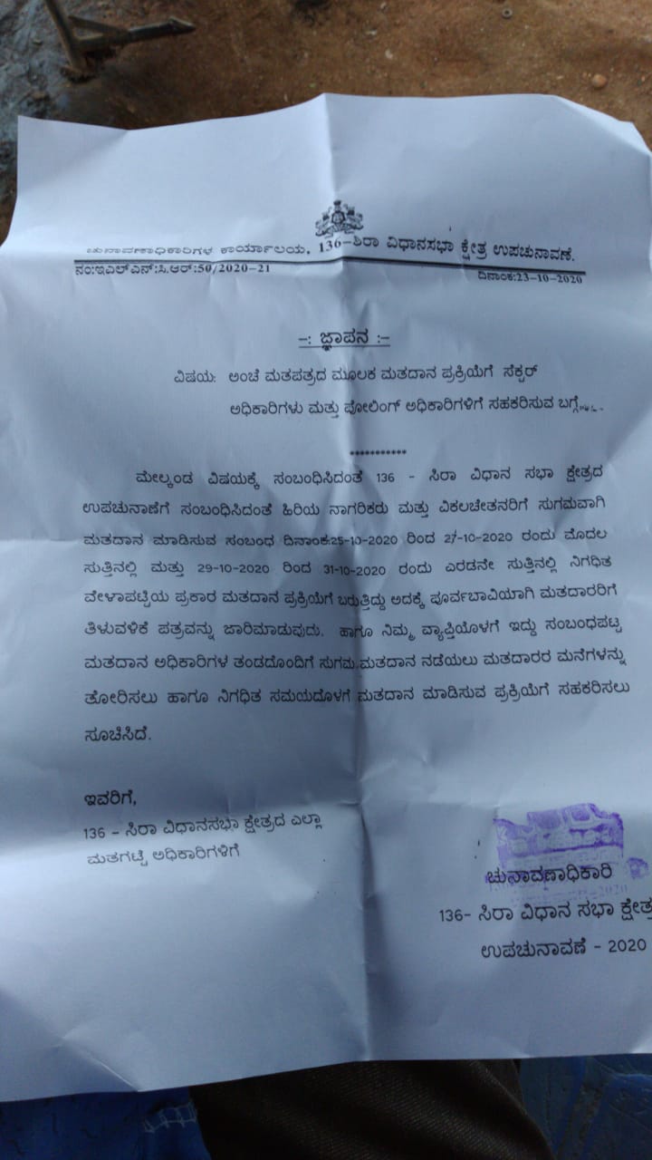 ಸಿರಾ ವಿಧಾನಸಭಾ ಕ್ಷೇತ್ರಕ್ಕೆ ನವೆಂಬರ್ 3ರಂದು ನಡೆಯುತ್ತಿರುವ ಮತದಾನಕ್ಕೆ ಮೊದಲೇ ಈ ಪ್ರಕ್ರಿಯೆ ಪೂರ್ಣಗೊಳಿಸಲು ಸಂಪೂರ್ಣ ಸಿದ್ದತೆಯನ್ನು ಮಾಡಿಕೊಳ್ಳಲಾಗಿದೆ.